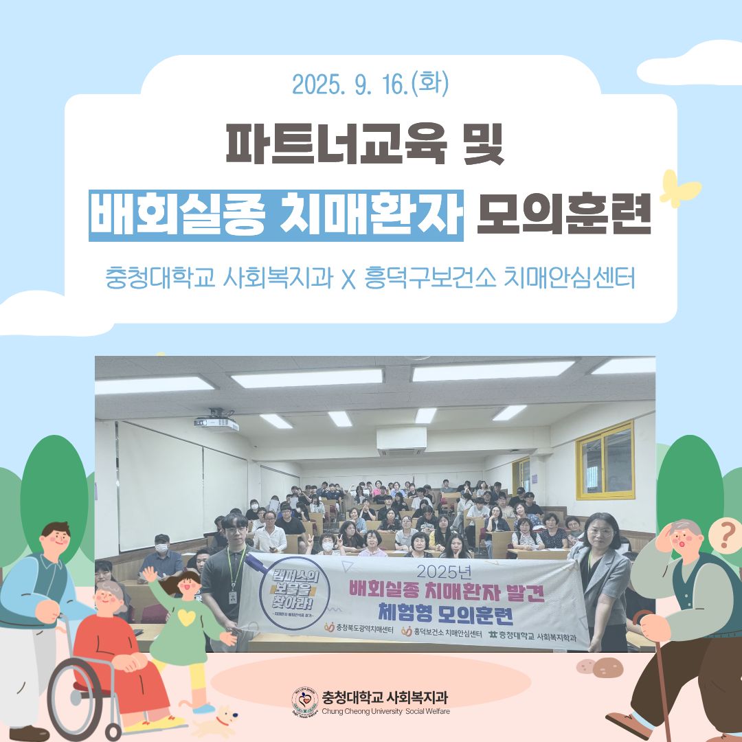 흥덕구보건소 치매안심센터가 충청대학교 사회복지과에 뜻깊은 행사와 함께 찾아왔습니다! 사회복지과 전학년을 대상으로 배회실종 치매환자 특강 및 파트너교육을 진행하고 일주일 동안 모의훈련을 통해 학생들이 실제상황에서도 힘을 쓸 수 있도록 했습니다 이번 활동을 통해 학생들이 사회에서 생활하며 시야를 넓히고 배운 것들을 실천하면 좋을 것 같습니다! |