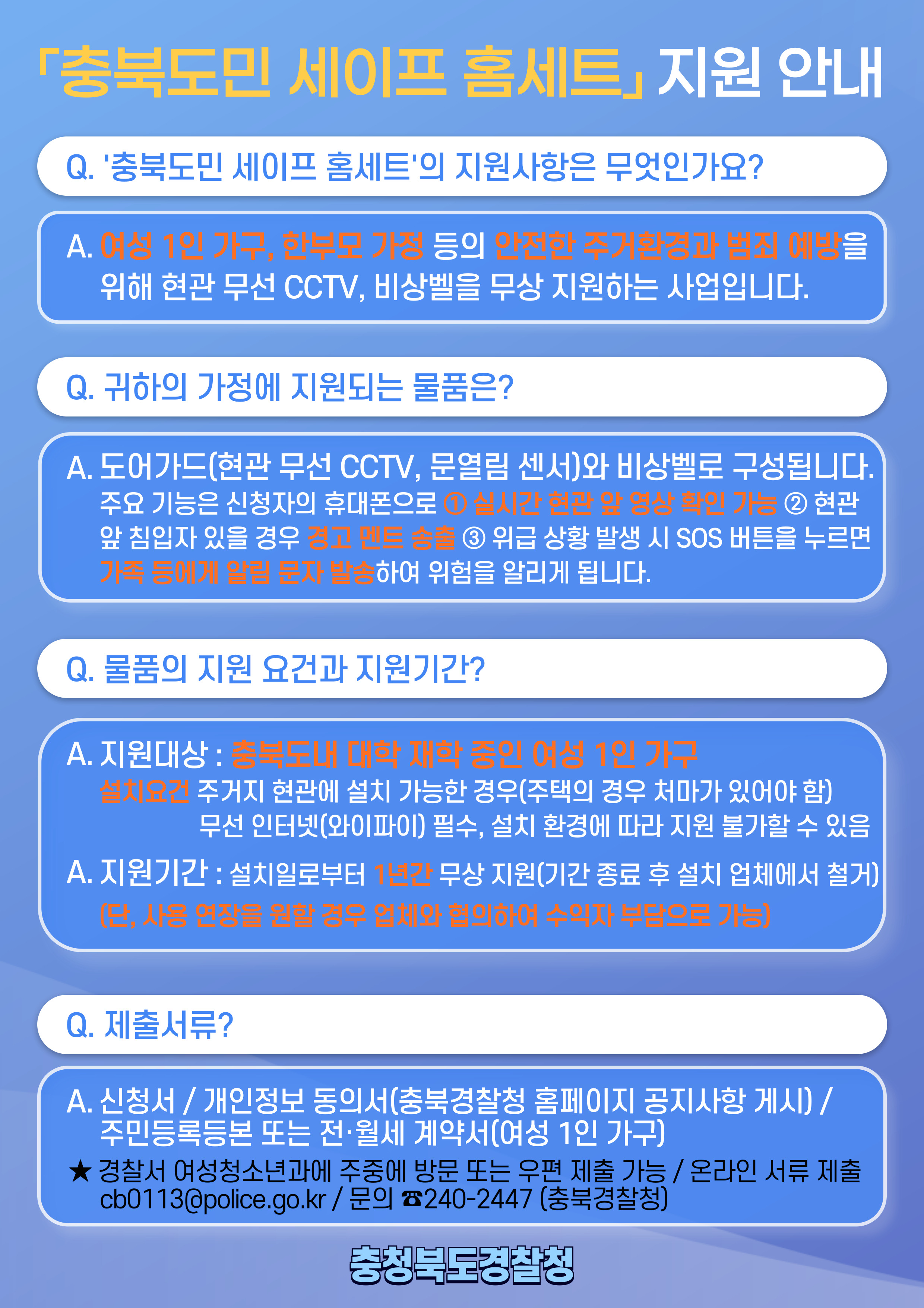 일반공지 학생공지 일반공지 장학/학자금 공지 감염병안내 공모/모집/시험 도서관 생활관 기부금공개 업무추진비공개 보육교원연수원 기타공고 충청대학교_대표-학생공지(대표_충청마당_공지사항_학생공지) 상세보기 - 제목, 내용, 파일, 작성자, 조회수, 작성일, 학과공지, 주소링크 정보 제공 [인권센터] 대학생 여성 1인 가구 대상 보안장비 무상지원 안내 작성자 : 이정민 작성일 : 2025-10-24 조회 : 85 도내 대학 재학 중인 여성 1인 가구 대상, 세이프안심홈세트 지원 안내입니다. 파일 jpg 문서 안심장비 세이프 홈세트 지원 안내문.jpg hwp 문서 서비스 이용 신청서 및 개인정보 수집이용 동의서(공통 ).hwp 주소링크 목록 게시물삭제 광고 반복작성 욕설 본인삭제 게시물삭제 이전글 【취업허브센터】 2025 모의면접 경진대회(11.19.(수)) 행사 안내 다음글 [노란화분] 해외 취업 사기 범죄 예방 안내